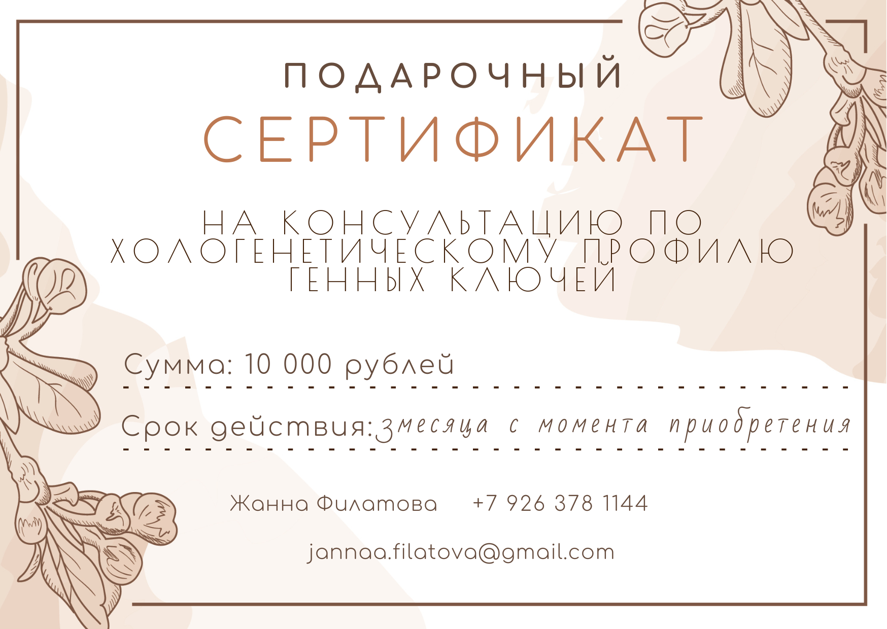 ПОДАРОЧНЫЙ СЕРТИФИКАТ НА КОНСУЛЬТАЦИю ПО ХОЛОГЕНЕТИЧЕСКОМУ ПРОФИЛЮ ГЕННЫХ КЛЮЧЕЙ
